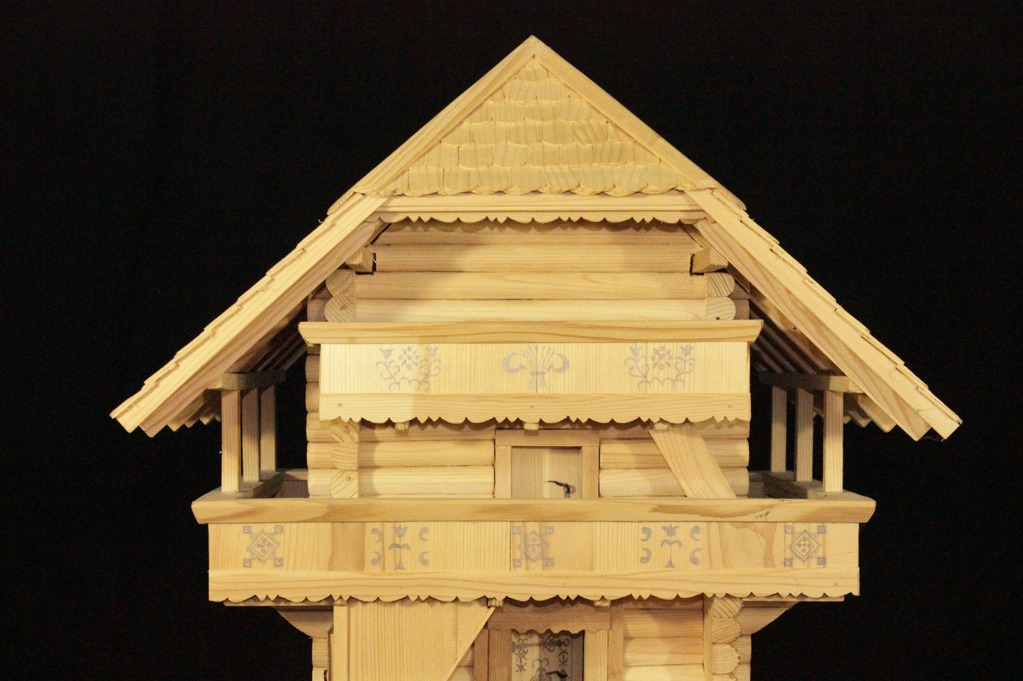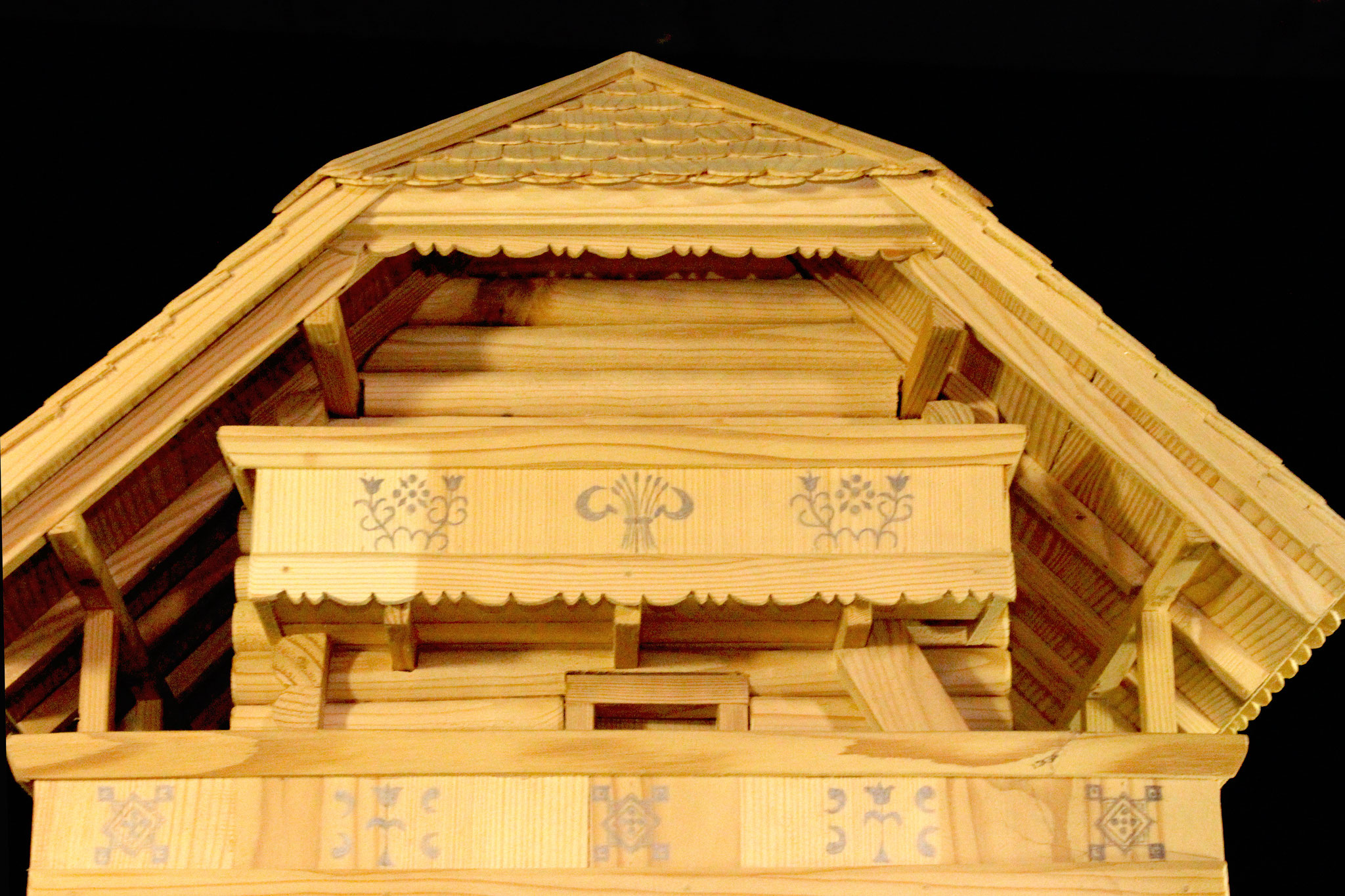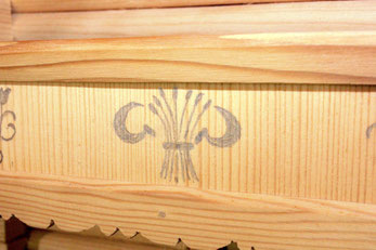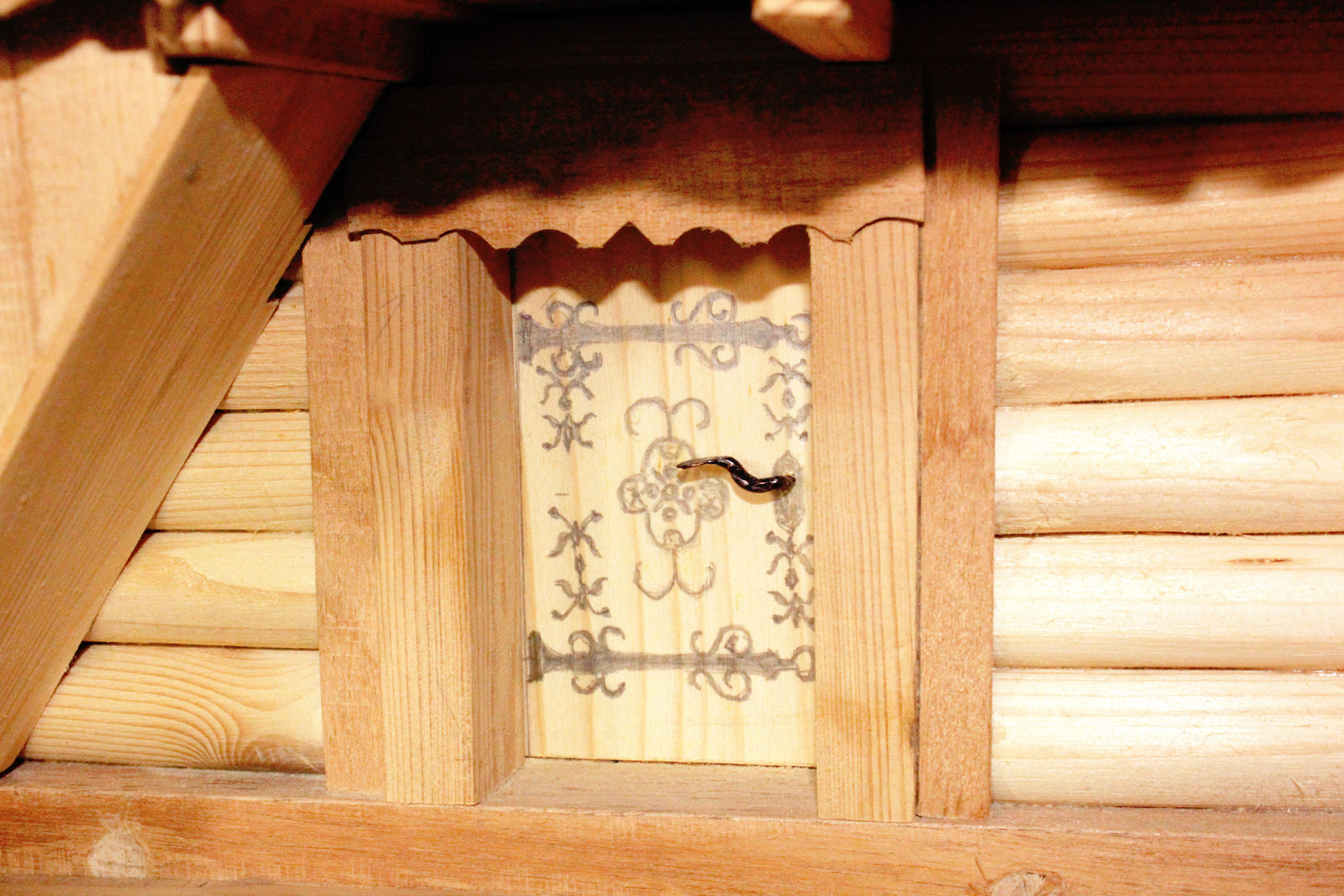 Einzelne Motive sind mit Hilfe von Lineal und Zirkel hingesetzt worden. Auf der untersten Türe und der oberen Laube sind Wappen-Lilien und -Löwen aufschabloniert; dabei finden sich aber Tulpen und Nelken aus freier Hand gemalt. Wie damals üblich, hat sich der Künstler nur auf die Farben rot und schwarz beschränkt und dadurch auf dem dunkelbraunen Holz eine ungemein harmonische Wirkung erzielt.