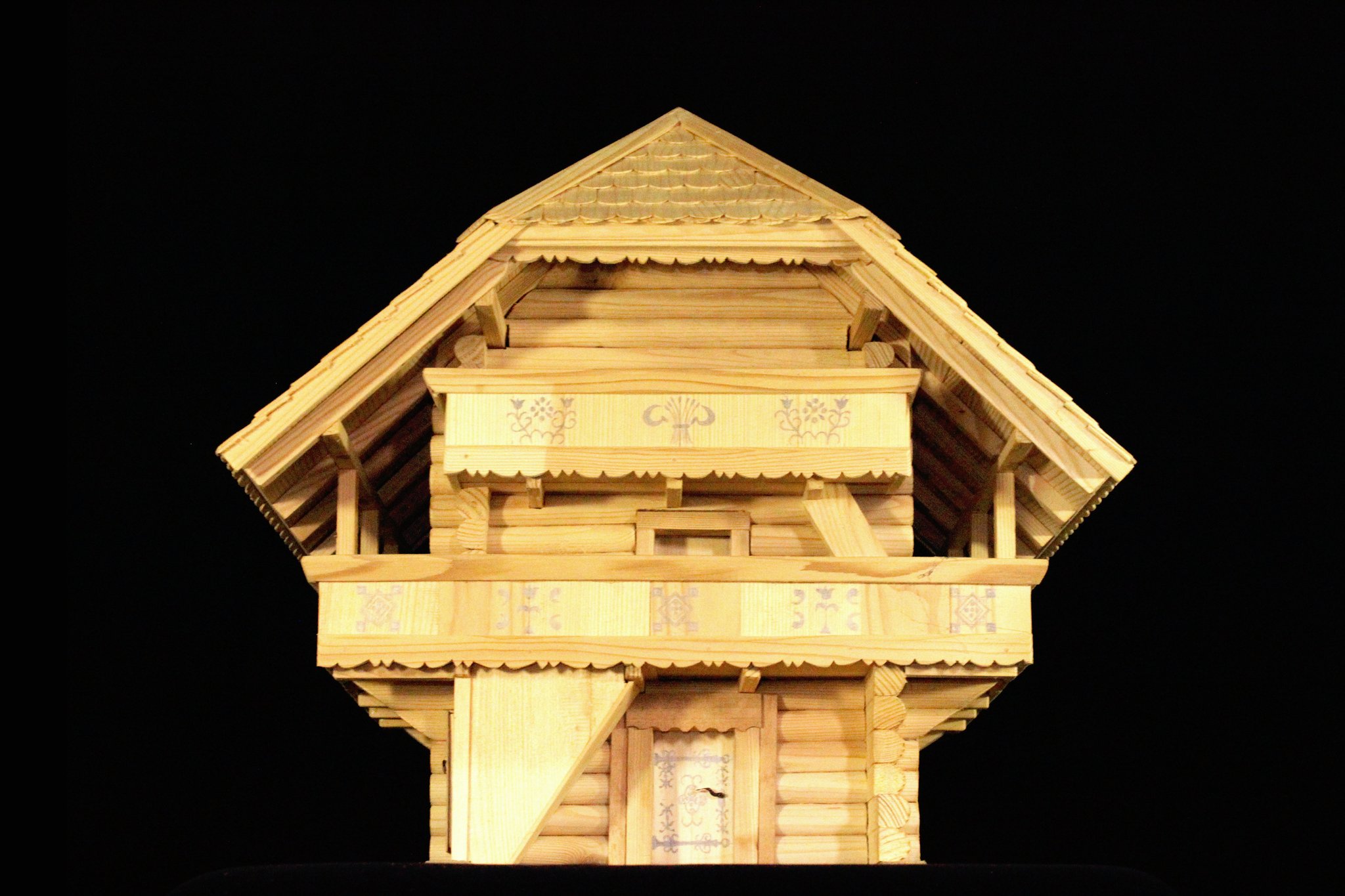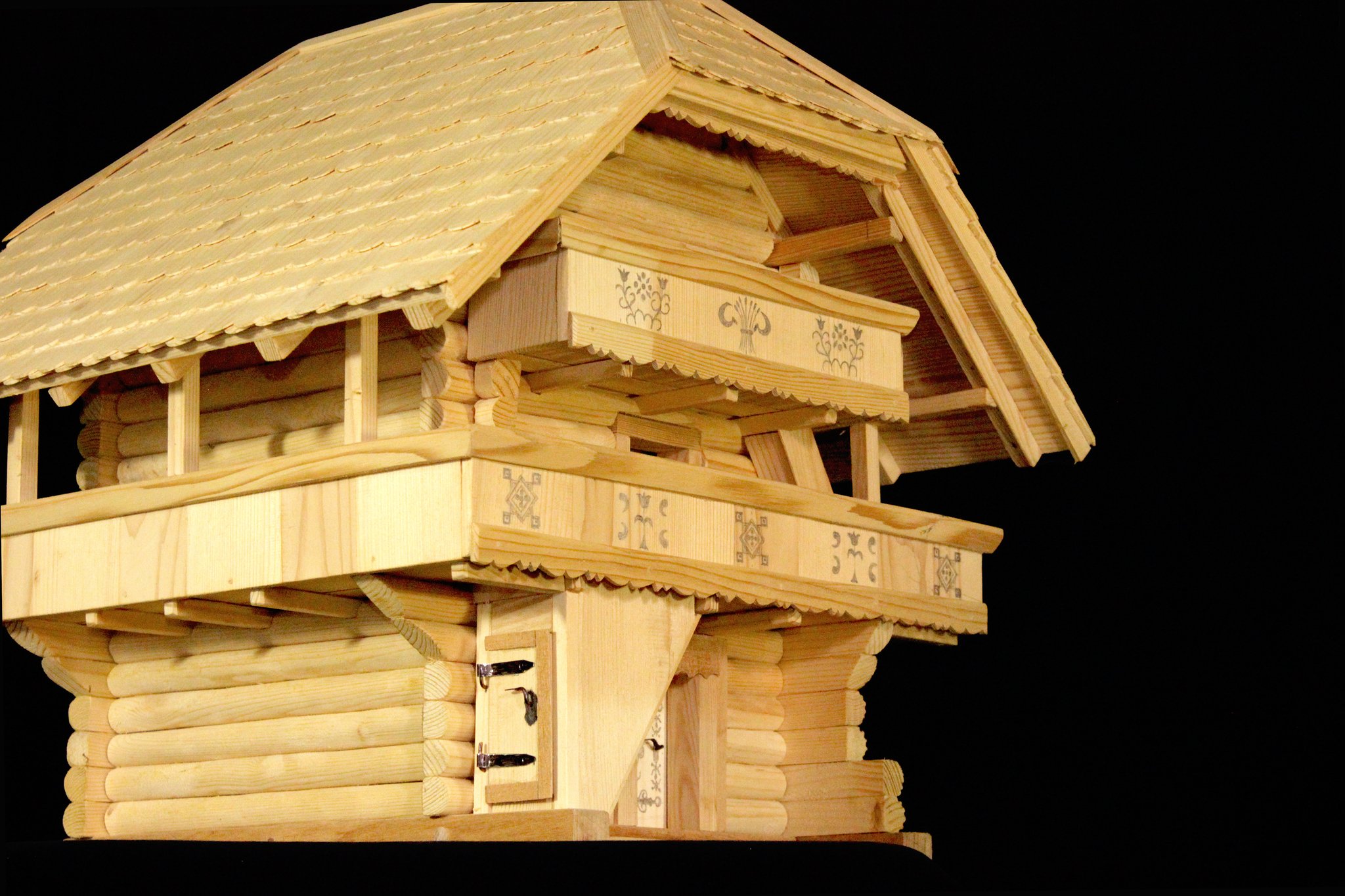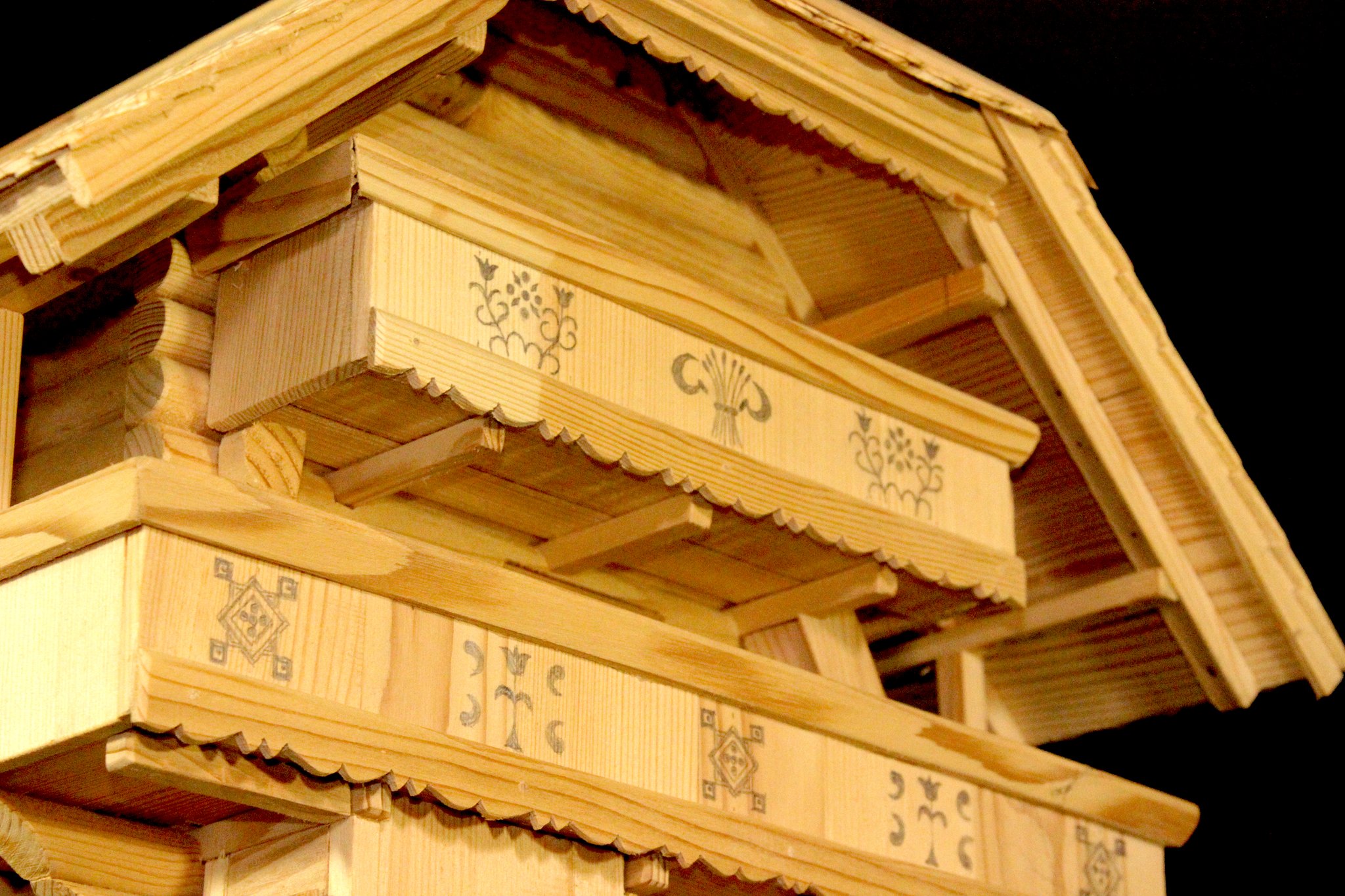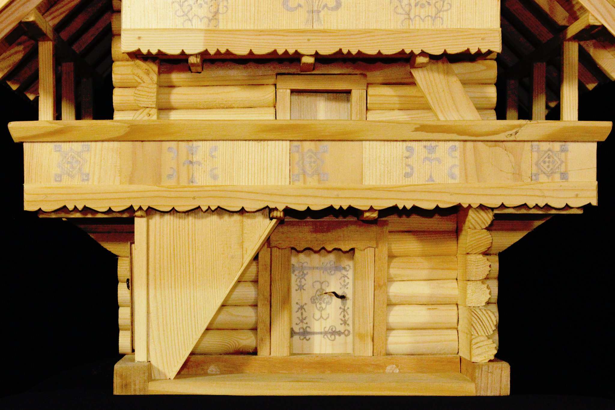 Einzelne Motive sind mit Hilfe von Lineal und Zirkel hingesetzt worden. Auf der untersten Türe und der oberen Laube sind Wappen-Lilien und -Löwen aufschabloniert; dabei finden sich aber Tulpen und Nelken aus freier Hand gemalt. Wie damals üblich, hat sich der Künstler nur auf die Farben rot und schwarz beschränkt und dadurch auf dem dunkelbraunen Holz eine ungemein harmonische Wirkung erzielt.